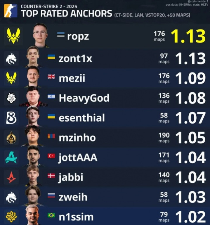 直播吧12月21日讯根据由statsmeister1与NER0cs基于HLTV数据联合发布的“COUNTER-STRIKE2-2025”赛季综合统计,在严格限定为CT方(防守方)、线下赛事(LAN)、对阵世界排名前20战队、且出场地图数超过50张的顶级主防者(TOPRATEDANCHORS)评分榜单中,选手ropz以1.13的评分位列榜首;